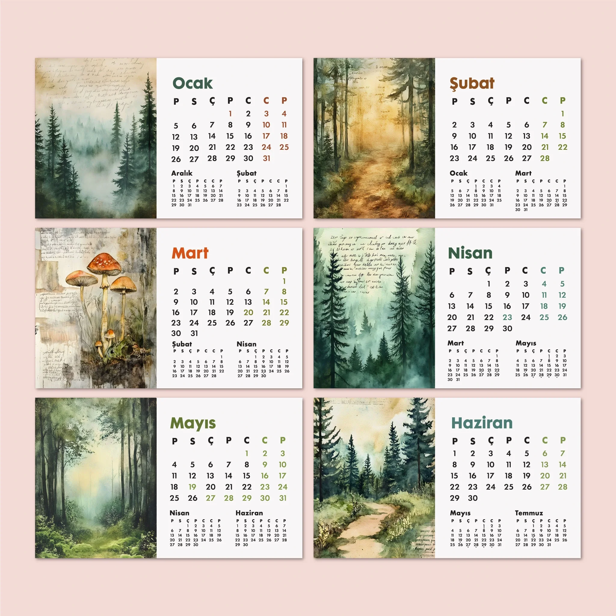 Bu 2026 Orman Temalı Masa Takvimi, sisli çam ağaçları, orman yolları ve doğadan ilham alan suluboya illüstrasyonlarıyla hazırlanmıştır. Her ay, farklı bir orman manzarasıyla yıl boyunca doğanın dinginliğini hissettirir.