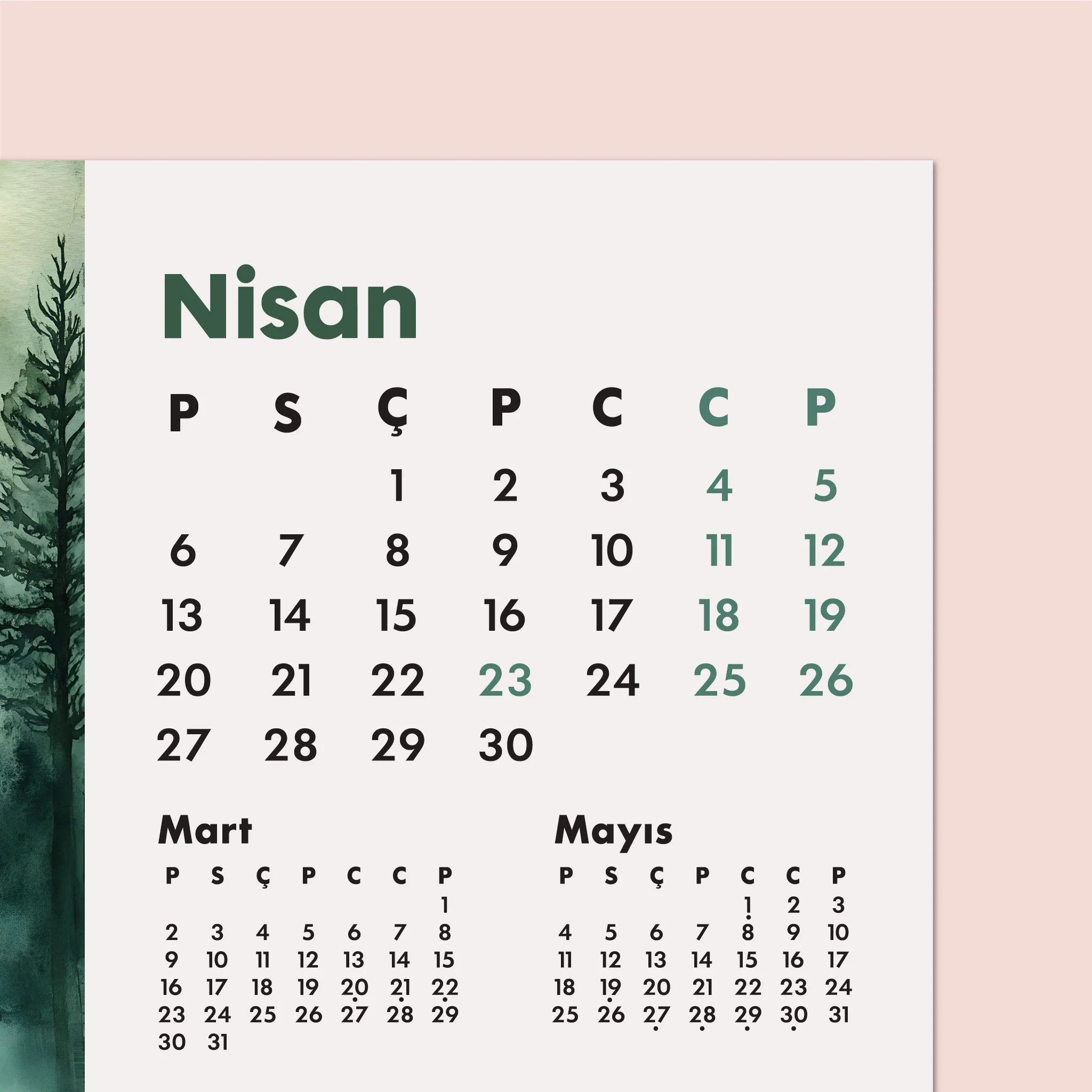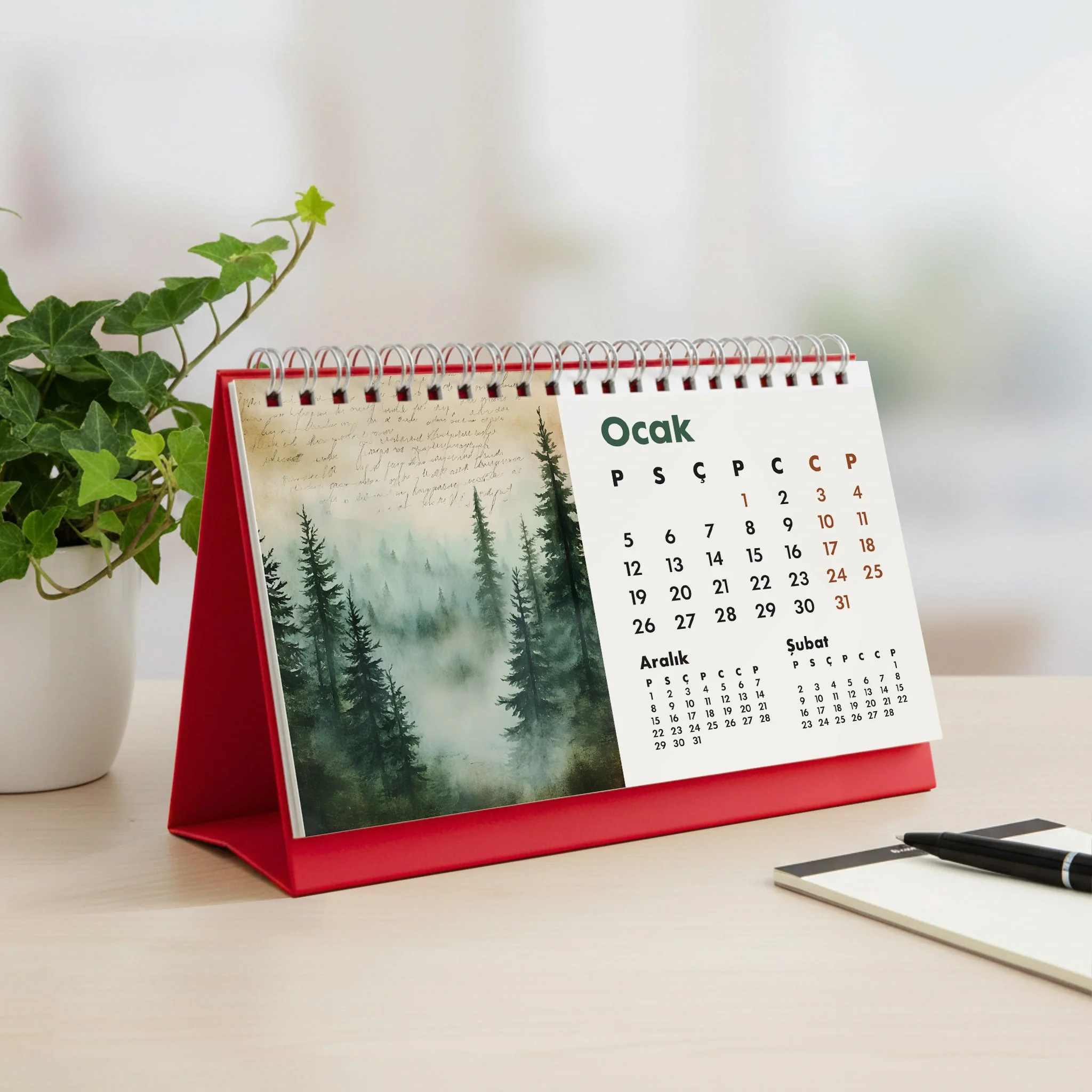 orman takvimi, masa takvimi, doğa temalı takvim, 2026 takvim, suluboya takvim, minimalist masa takvimi, ofis dekoru, hediye fikirleri, doğa illüstrasyonu, kraft ayaklı takvim, estetik masa ürünü, pine tree calendar, masaüstü planlayıcı, doğadan ilham, forest calendar, woodland decor, 2026 desk, nature calendar
