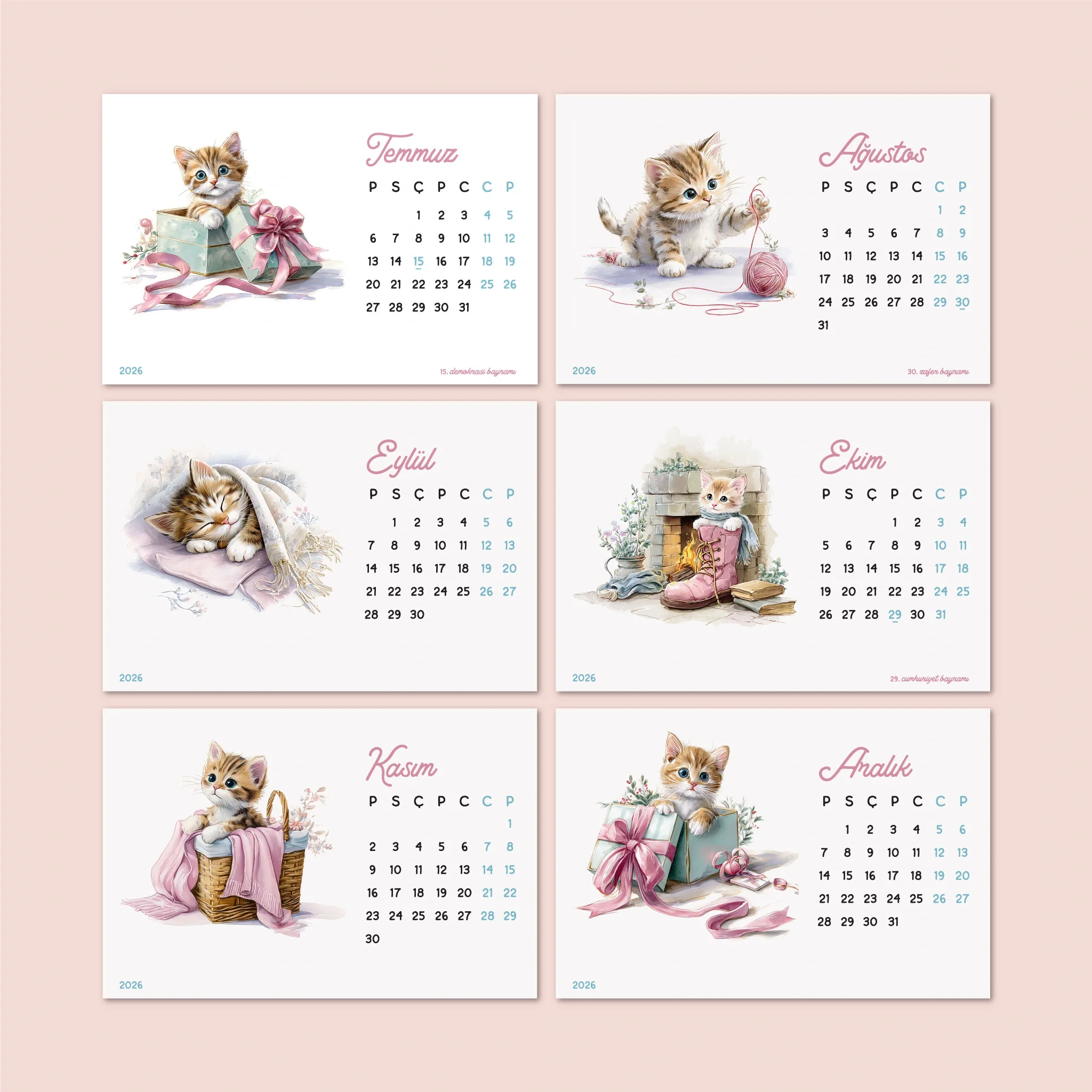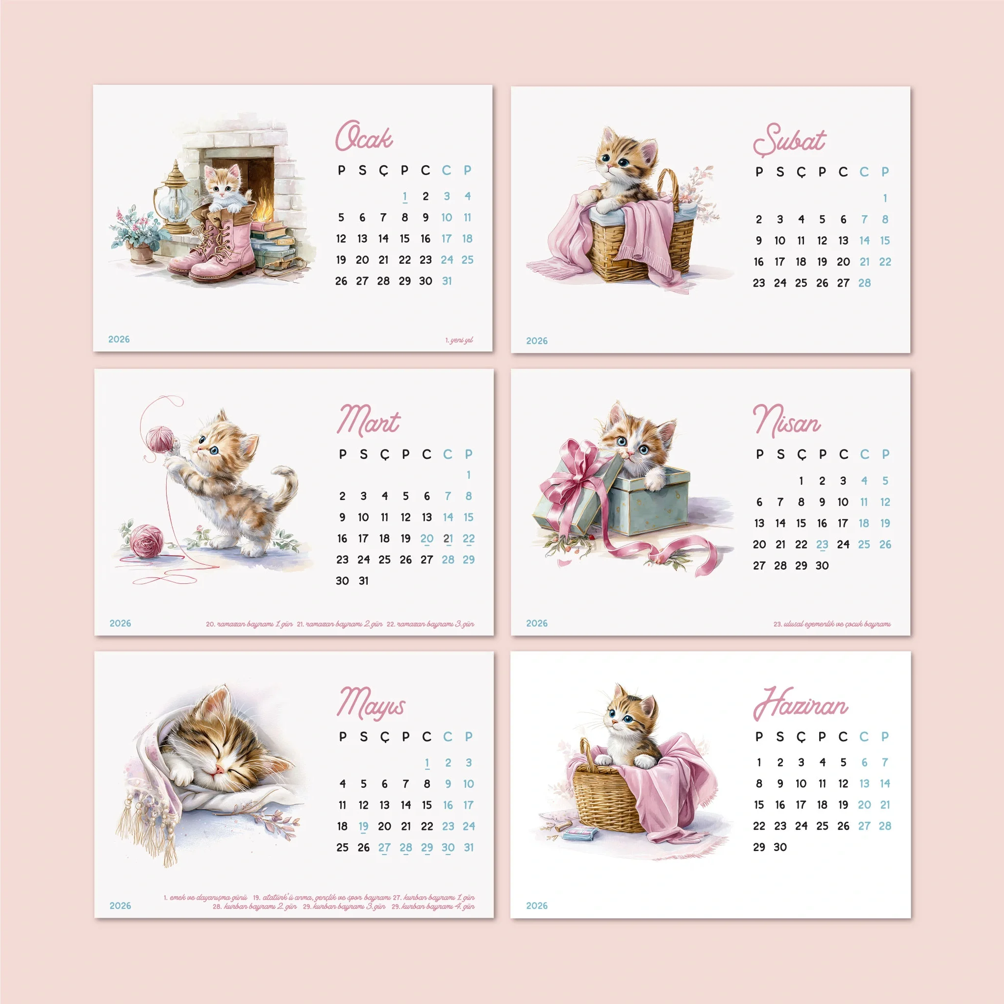 Modern tarzı, pastel pembe ve mavinin rahatlatıcı tonlarıyla hazırlanan Sevimli Yavru Kedi illüstrasyonlu 2026 Masa Takvimi, masanıza şık ve huzurlu bir hava katıyor.