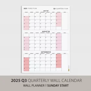 Amerikan Standardı Takvim, Üç Aylık Planlayıcı 2026 Duvar Takvimi, Temmuz - Eylül 2026, 90 Günlük Planlama, Yılın Üçüncü Çeyreği Takvimi, Pembe Takvim, Pazar Günü Başlangıçlı Takvim - 35x50cm