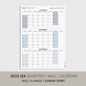 Amerikan Standardı Takvim, Üç Aylık Planlayıcı 2025 Duvar Takvimi, Ekim - Aralık 2025, 90 Günlük Planlama, Yılın Dördüncü Çeyreği Takvimi, Gri Takvim, Pazar Günü Başlangıçlı Takvim - 35x50cm