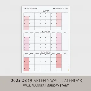 Amerikan Standardı Takvim, Üç Aylık Planlayıcı 2025 Duvar Takvimi, Temmuz - Eylül 2025, 90 Günlük Planlama, Yılın Üçüncü Çeyreği Takvimi, Pembe Takvim, Pazar Günü Başlangıçlı Takvim - 35x50cm