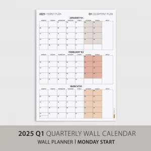 Üç Aylık Planlayıcı 2025 Duvar Takvimi, Ocak - Mart 2025, 90 Günlük Planlama, Yılın Birinci Çeyreği Takvimi - 35x50cm