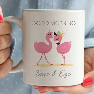 Sevgililere Özel İsimli Kupa Bardak - Flamingo - Good Morning
